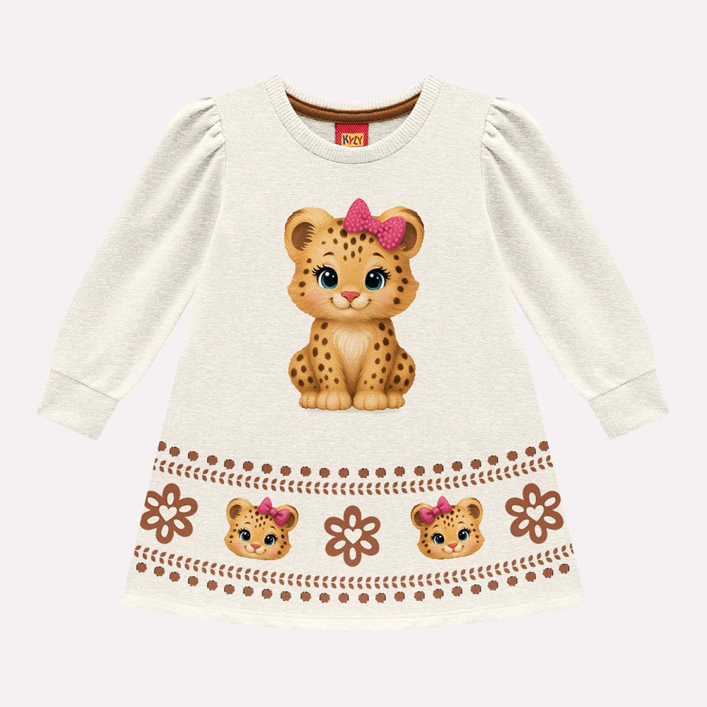O destaque fica por conta da estampa localizada de oncinha com laço, enriquecida com aplicação de strass que traz um brilho sutil e sofisticado. A barra apresenta uma estampa inspirada na natureza com flores e elementos delicados, criando uma composição harmoniosa e encantadora. Os detalhes bem elaborados valorizam o acabamento e tornam a peça ainda mais especial. Um vestido infantil menina ideal para passeios, ocasiões especiais e momentos de lazer, unindo conforto, estilo e um toque de brilho na medida certa.