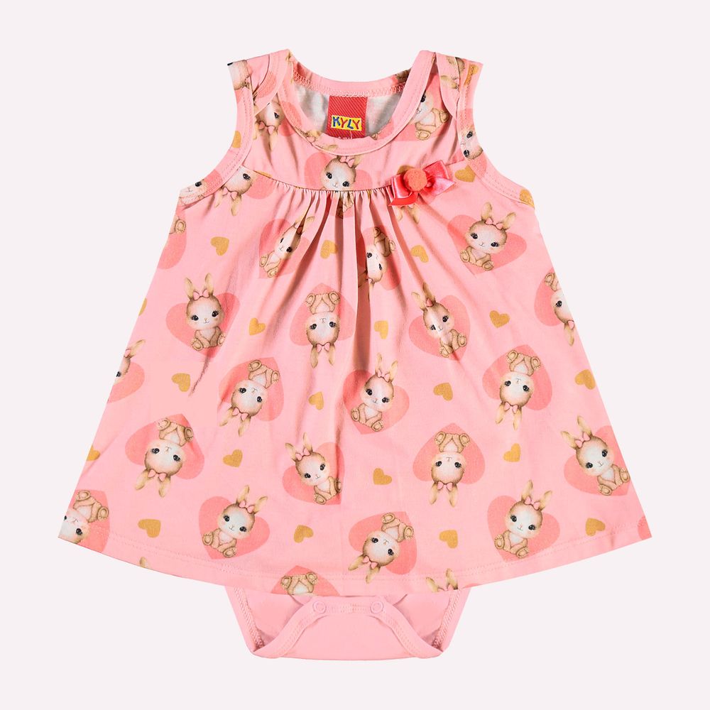 A parte interna conta com body em cotton, com composição de 95% algodão e 5% elastano, proporcionando ajuste confortável, elasticidade suave e segurança nos movimentos. A estampa rotativa de coelhinhos e corações traz um visual lúdico e delicado, ideal para celebrações de Páscoa ou para momentos cheios de ternura. O acabamento interno limpo reforça a qualidade e o cuidado nos detalhes, característicos da Kyly. Uma peça pensada para vestir com carinho, conforto e elegância desde os primeiros meses, sempre com a qualidade e o cuidado que são marca registrada da Kyly.