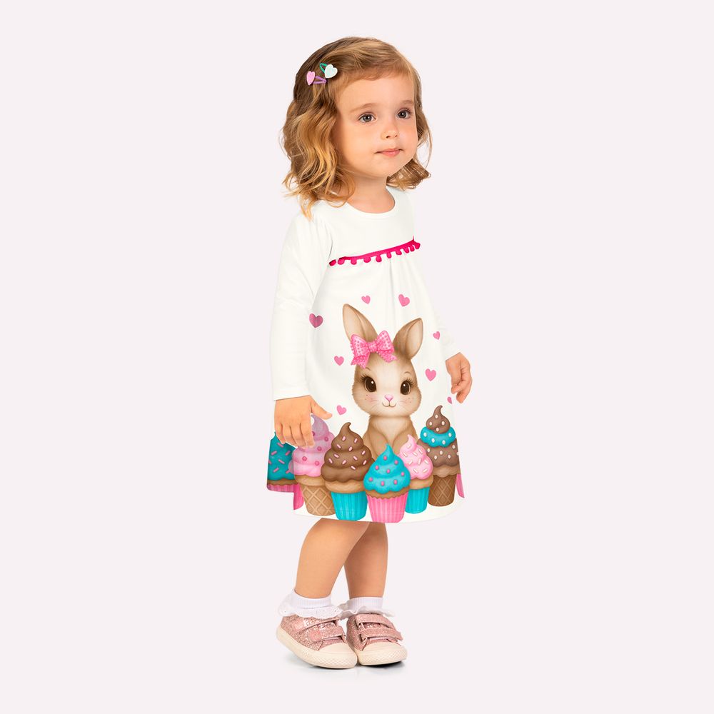 O destaque fica por conta da estampa localizada de coelhinha rodeada por cupcakes e pequenos corações, criando uma composição doce e encantadora. O detalhe de strass aplicado adiciona brilho sutil e sofisticado à ilustração, enquanto os aviamentos decorativos na parte superior valorizam ainda mais o design da peça, trazendo um acabamento delicado e especial. Perfeito para ocasiões especiais, passeios ou momentos festivos da temporada, este vestido infantil menina une conforto, charme e a qualidade reconhecida da marca Kyly.